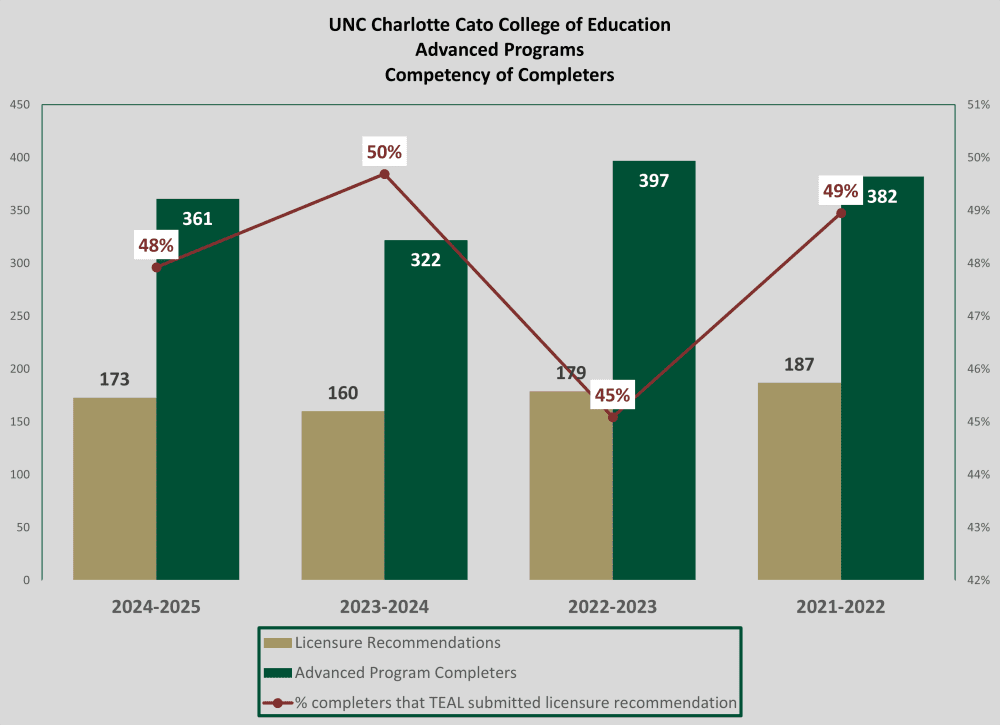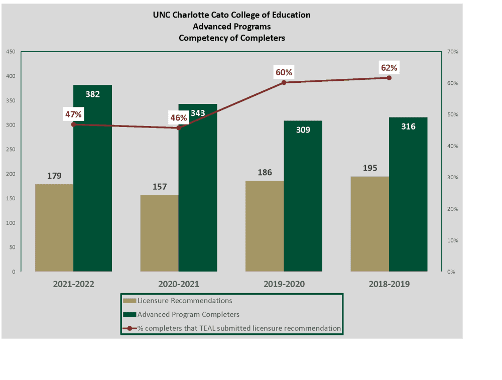 All advanced program completers are eligible to apply for an advanced professional educator’s license through the North Carolina Department of Public Instruction (NCDPI). Recommendations for licensure are completed by the Office of Teacher Education Advising & Licensure (TEAL) at UNC Charlotte once a completer submits the application to NCDPI and meets all requirements for the license. Below is a data table showing the number of advanced program completers, the number of advanced licensure recommendations completed by the TEAL office, and the percentage of the advanced program completers recommended by the TEAL office. Note: While all advanced program completers who pass NCDPI-required exams (when applicable) are eligible to be recommended for an advanced license in NC, not all completers immediately apply. The data below represent only those advanced completers who applied for licensure.