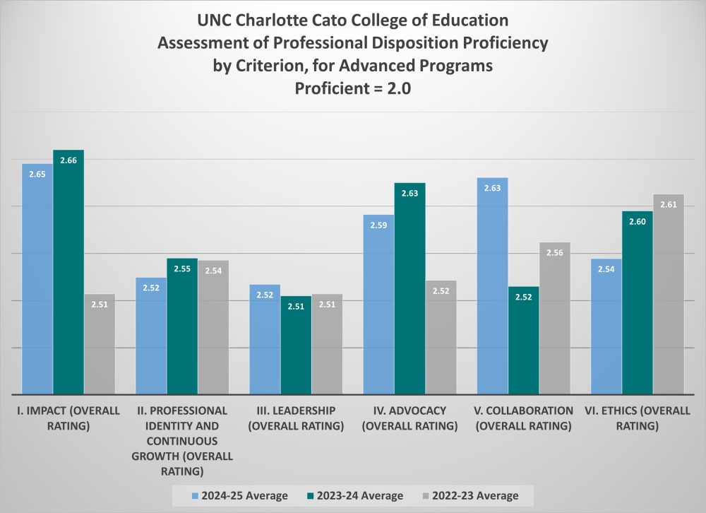 The mission of the Cato College of Education is to prepare highly effective and ethical professionals whose work positively impacts the people and organizations they serve in urban, rural, and other diverse settings. In order to prepare Advanced Program completers to uphold these standards, UNC Charlotte Cato College of Education has developed an assessment of professional disposition process to evaluate, provide feedback, coach, and assess candidates at various points in the program progression. Candidates complete a dispositions self-assessment at the entry point to the program. Another disposition self-assessment and instruction midpoint evaluation is completed by an instructor in a designated course. At the end of the program, an affirmation to uphold the professional disposition is completed by the candidate. If any concerns are identified during the courses, faculty members work with the student to identify areas of need and methods to achieve the desired outcomes and submit documentation to the COED Office of Assessment & Accreditation regarding the disposition. The data table below shows the overall proficiency of advanced program students evaluated during the midpoint assessment of professional disposition. Data is collected at the end of each semester.