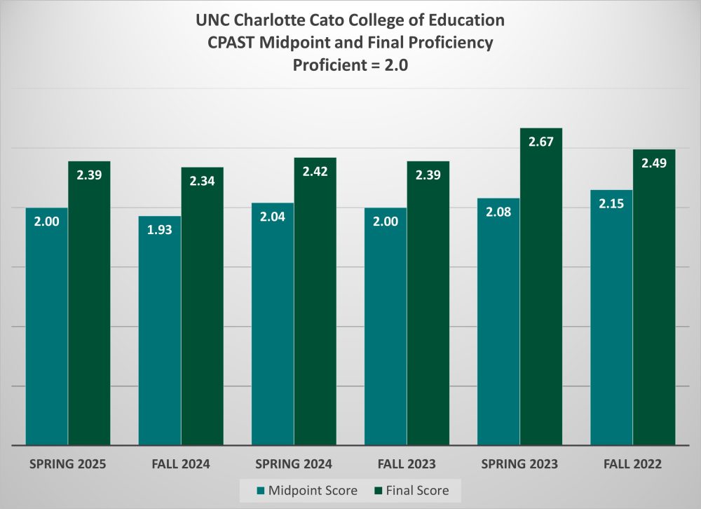 Beginning in fall 2020, student teaching candidates in the Cato College of Education at UNC Charlotte are assessed on the Candidate Pre-Service Assessment of Student Teaching tool (CPAST). Developed by The Ohio State University, the CPAST rubric has established validity and reliability and was specifically designed with meeting CAEP standards in mind. CPAST has 21 rubrics that cover seven domains: (1) Planning for Instruction and Assessment, (2) Instructional Delivery, (3) Assessment, (4) Analysis of Teaching, (5) Professional Commitment and Behaviors, (6) Professional Relationships, and (7) Critical Thinking and Reflective Practice. These collectively represent the content knowledge and pedagogical skills that candidates are required to demonstrate before being recommend for licensure at the end of their programs. Candidates receive evaluations at the midpoint and end of the semester. The data table below shows the midpoint and final average scores for three semester cycles collected with CPAST.