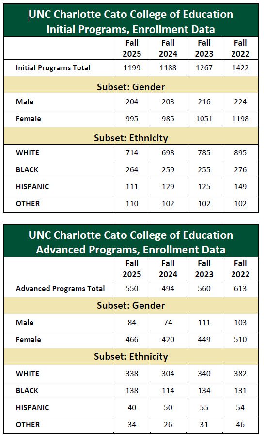The data tables in this section show the enrollment trends for the most recent fall semesters for the initial and advanced programs at UNC Charlotte Cato College of Education. The data includes only CAEP-accredited programs.