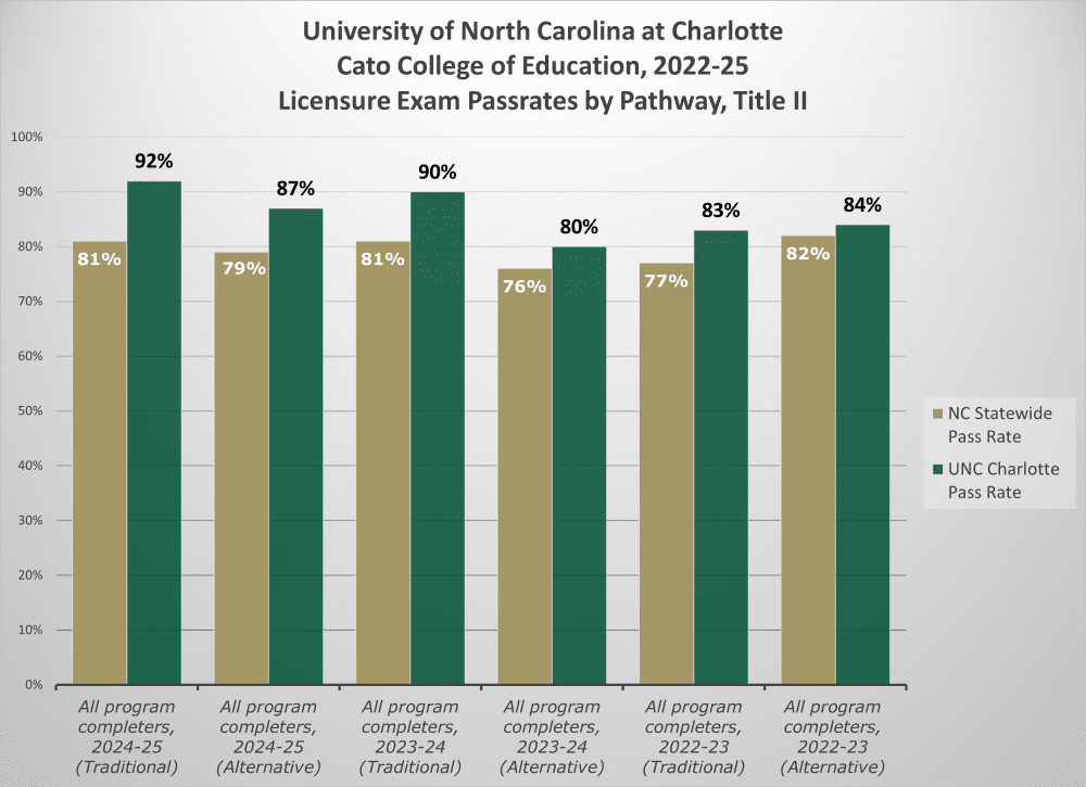 As part of the Higher Education Act, the Federal Title II reporting process collects data from all EPPs and state organizations to formulate one report with licensure exam pass rates for each institution compared to all test takers in the state. Teacher candidates must successfully pass one or more standardized exams within their first three years of licensure to convert their Initial Professional Educator License to a Continuing Professional Educator License. The table below shows the pass rates of UNC Charlotte candidates in comparison with the overall NC pass rates.