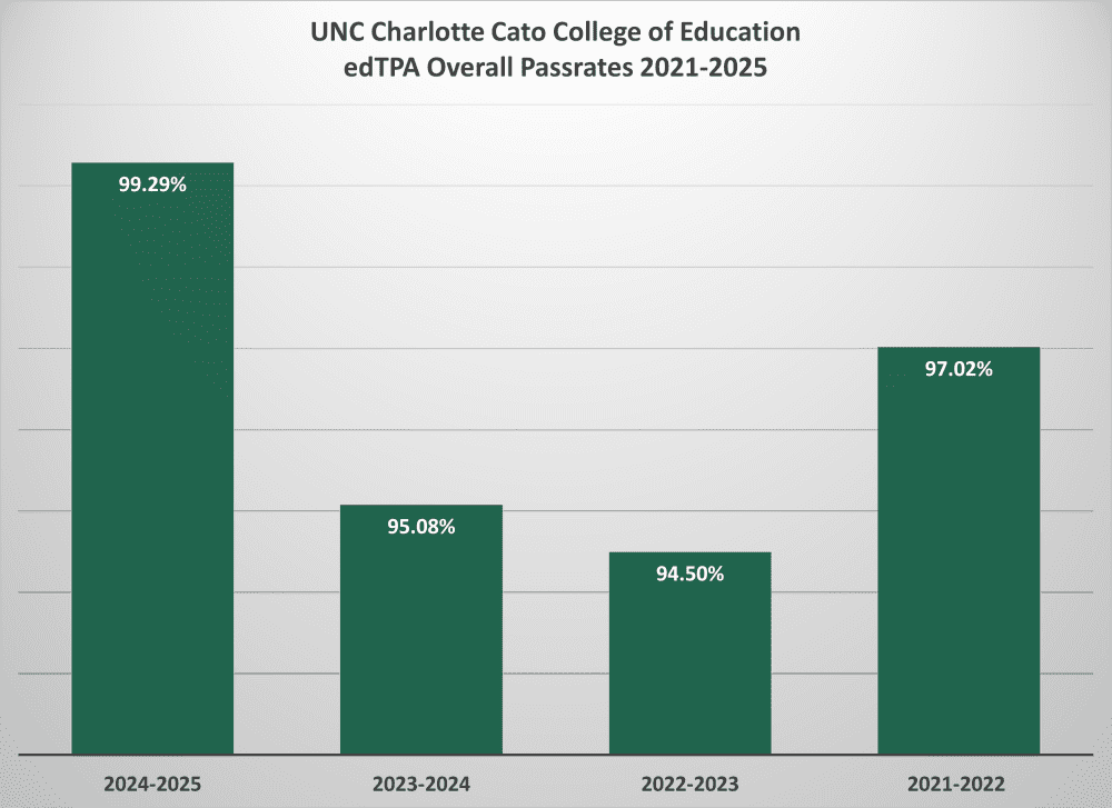 All candidates are required to complete the edTPA assessment for external scoring through Pearson during the full-time internship. edTPA is a pre-service assessment process designed by educators to answer the essential question: “Is a new teacher ready for the job?” edTPA includes a review of a teacher candidate’s authentic teaching materials as the culmination of a teaching and learning process that documents and demonstrates each candidate’s ability to effectively teach their subject matter to all students. Teacher candidates at UNC Charlotte complete the edTPA assessment aligned with the content area in which they are seeking licensure. Assessments vary by number of rubrics. The table below shows the overall pass rates of Charlotte candidates. *edTPA became consequential for NC licensure in fall 2019.